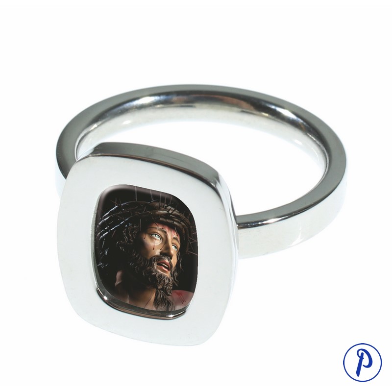 Anillo hecho en acero con imagen personalizada en medallita rectangular. Disponible en tallas surtidas.