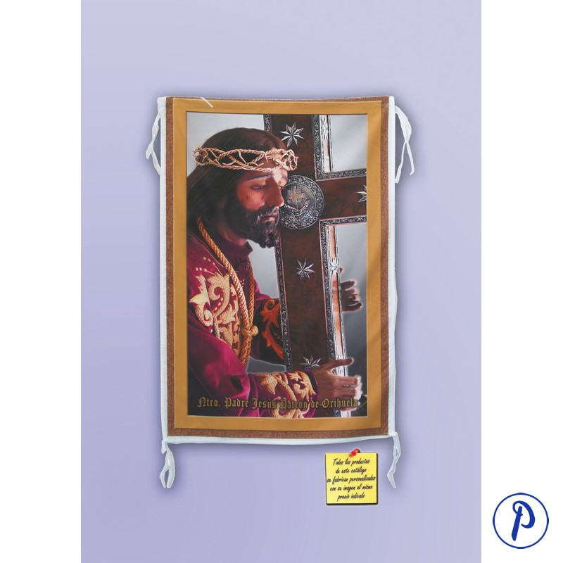 Colgadura de tela fina con diseño e imagen personalizada con cuatro cintas en los extremos para atar. Tamaño aproximado 70 x 100 cm.