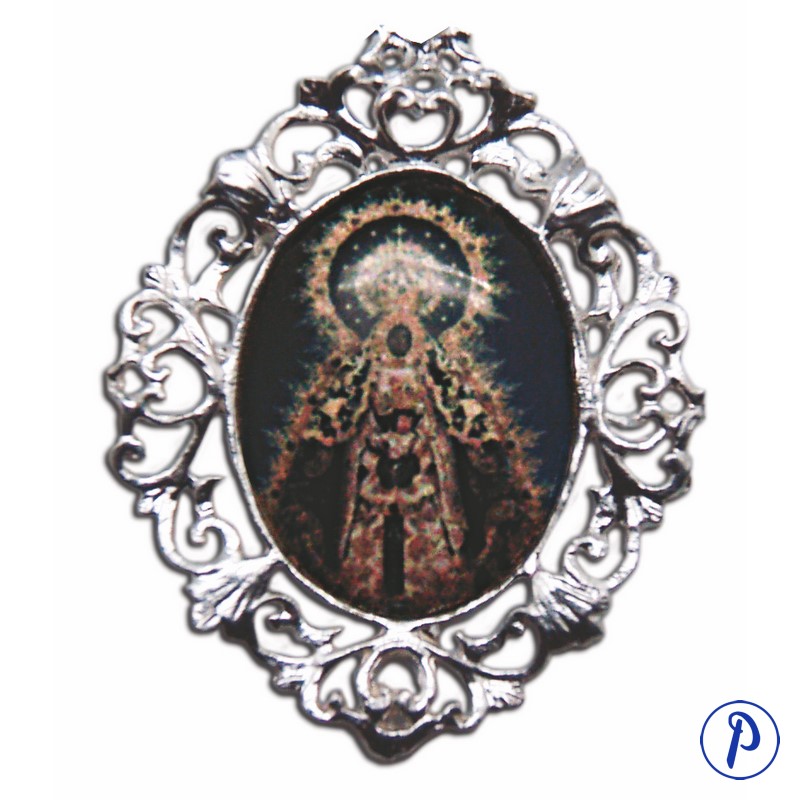 Broche en forma ovalada en plata con orla adornada calada con imagen personalizada. Tamaño aproximado 4,5 x 3 cm.