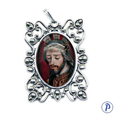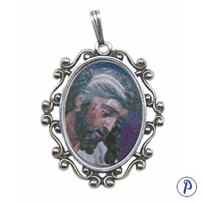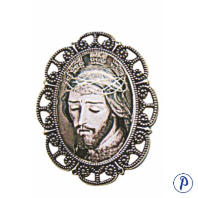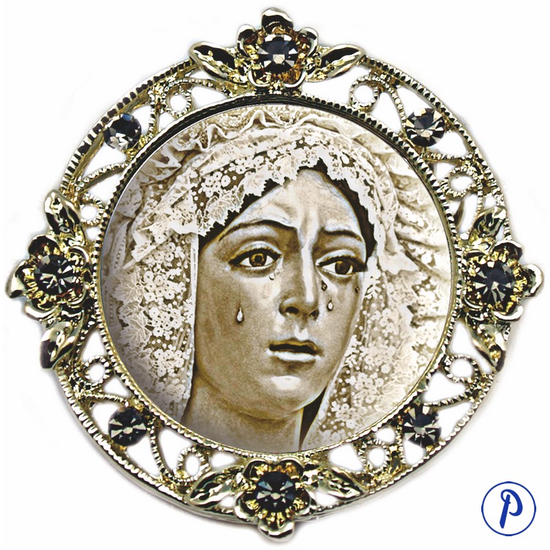 Broche en forma redonda con orla adornada calada con imagen personalizada y acabado cerámico.