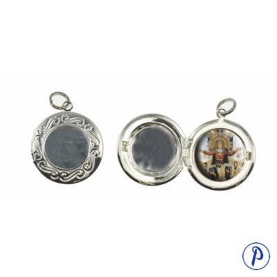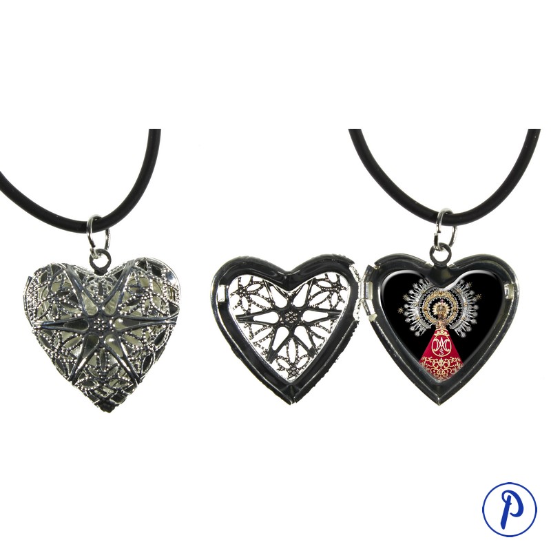 Camafeo en forma de corazón calado bañado en plata con foto personalizada en su interior. Con cordón negro para colgárselo.