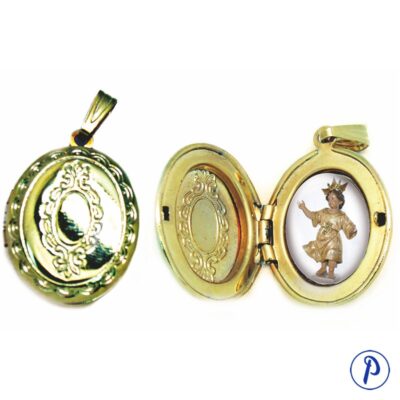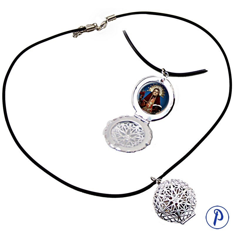 Camafeo en forma redonda calado bañado en plata con foto personalizada en su interior. Con cordón negro para colgárselo.