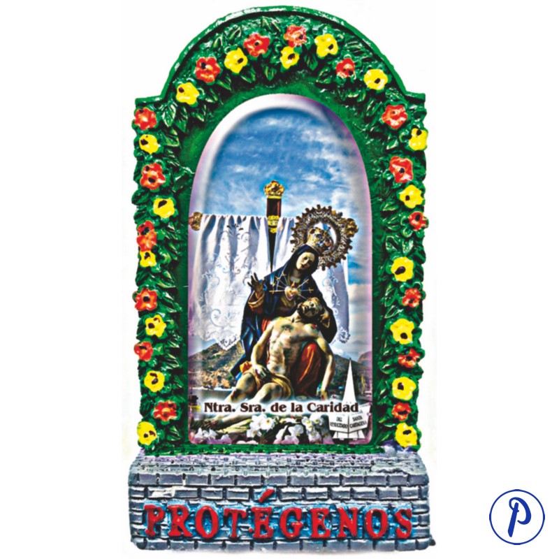 Imán en forma de capilla de resina bordeado con flores con imagen personalizada. Tamaño aproximado 7,5 x 4 cm.