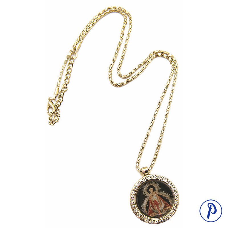 Colgante bañado en oro con medallita adornada con piedras, redonda e imagen personalizada fotoesmaltada.