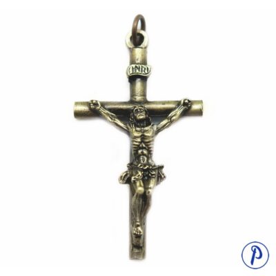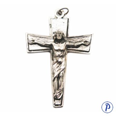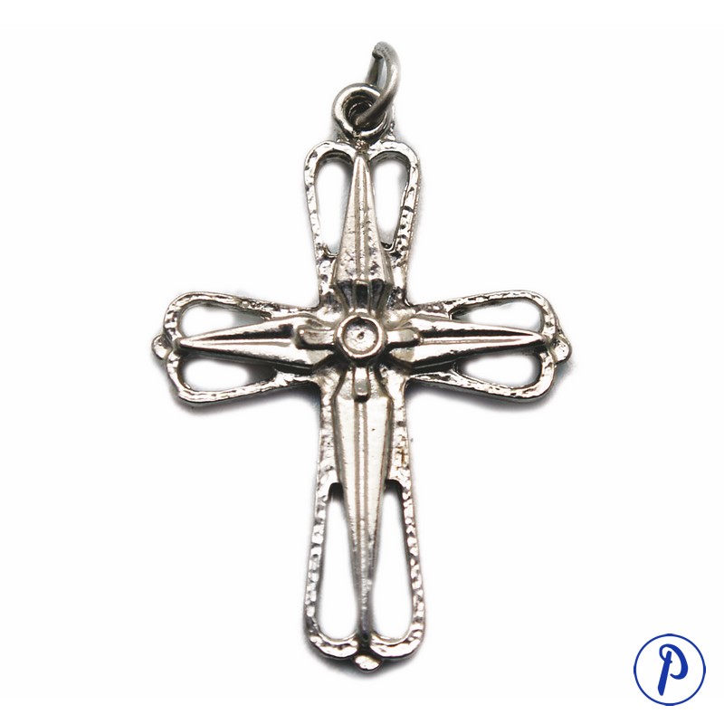 Cruz moderna calada con argolla en baño de plata. Tamaño aproximado 3,3 x 2,5 cm.