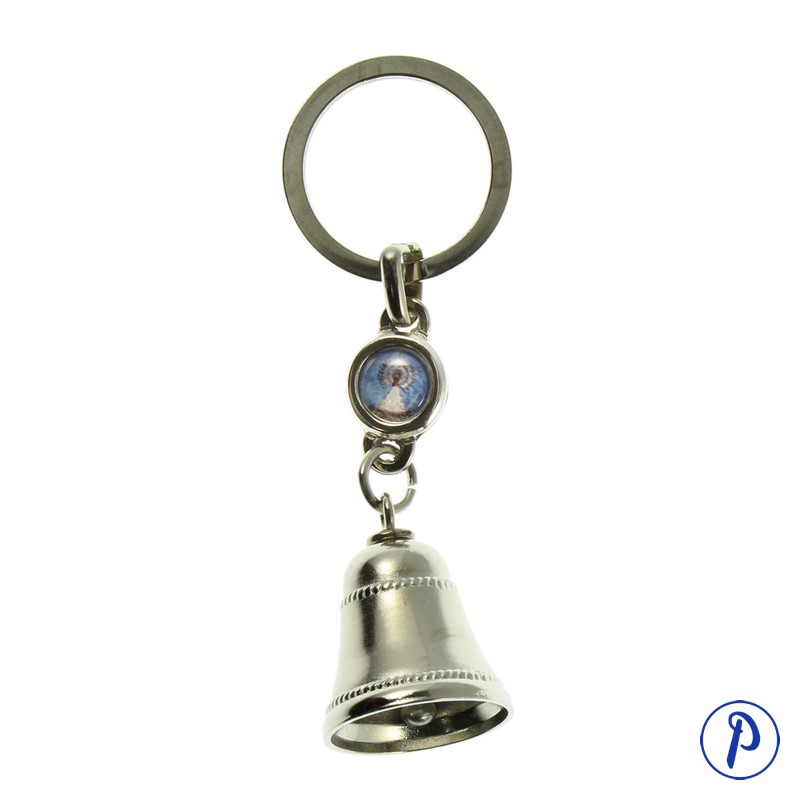 Llavero en forma de campana con imagen personalizada en medalla redonda. Tamaño aproximado 3 x 2,5 cm.
