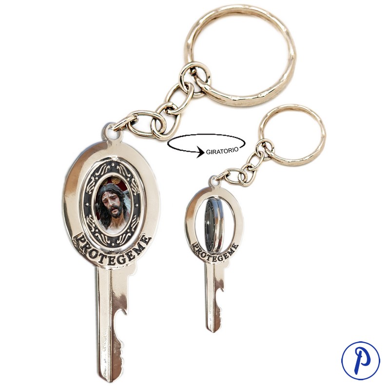 Llavero de metal en forma de llave con imagen personalizada ovalada giratoria. Aparece el texto «Protégeme». La parte de los dientes de la llave es un abrebotellas.