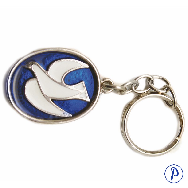 Llavero con paloma blanca y fondo azul. Forma ovalada. Tamaño aproximado 3,5 x 1,1 cm.