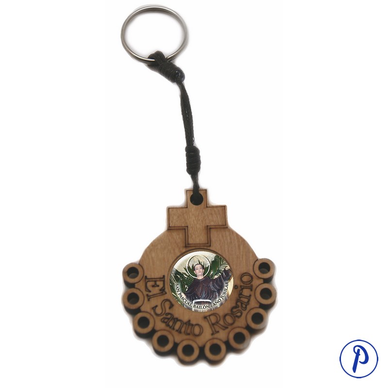 Llavero en forma de rosario en materia madera con bolas en color blanco y madera. Con medallita redonda con imagen personalizada. Tamaño aproximado 8 x 2 cm.