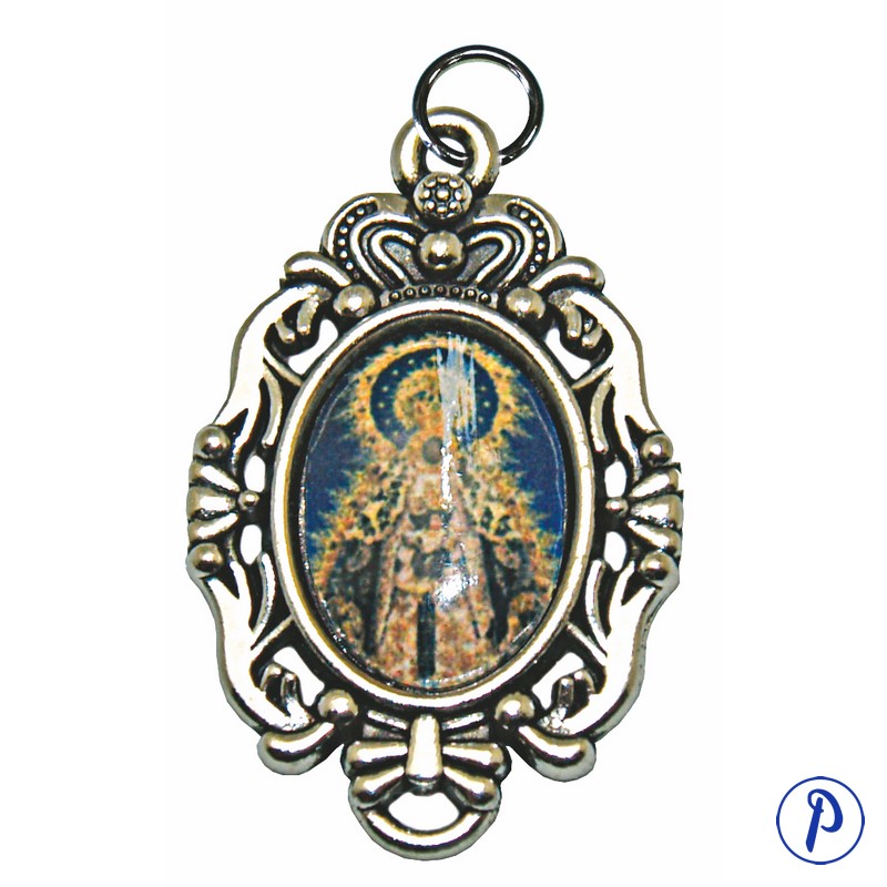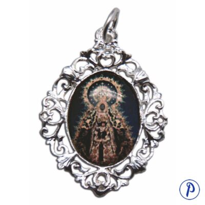 Medallita en forma olvalada con orla adornada calada con imagen personalizada y acabado cerámico. Tamaño aproximado 3 x 2 cm.