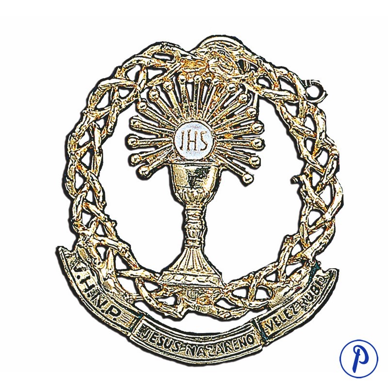 Medalla de cofradía en baño de oro con corona de espinas en 3 hilos calada con silueta. Tamaño aproximado 6,5 x 5,5 cm.