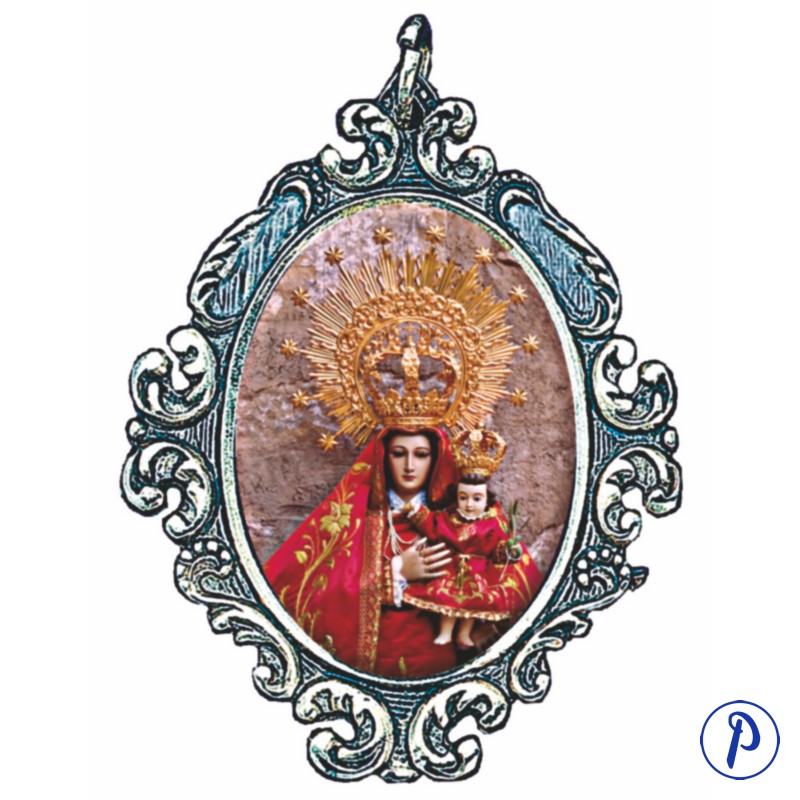 Medalla de cofradía en niquel con forma ovalada. Imagen personalizada fotoesmaltada. Tamaño aproximado 7 x 6 cm.