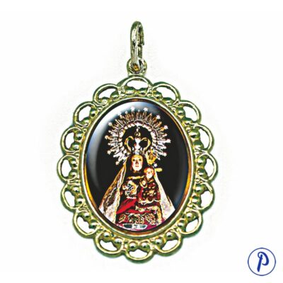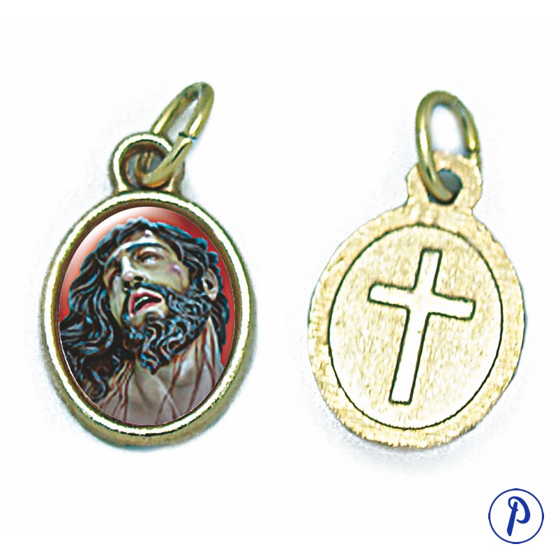 Medallita con forma ovalada en baño de oro con dos caras. Por una cara imagen personalizada fotoesmaltada y por otra cara cruz. Tamaño aproximado 1,5 x 10 cm.
