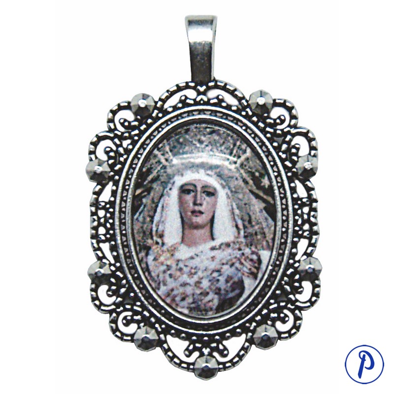 Medallita con orla calada, con piedras e imagen personalizada ovalada y acabado cerámico. Tamaño aproximado 4,5 x 3 cm.