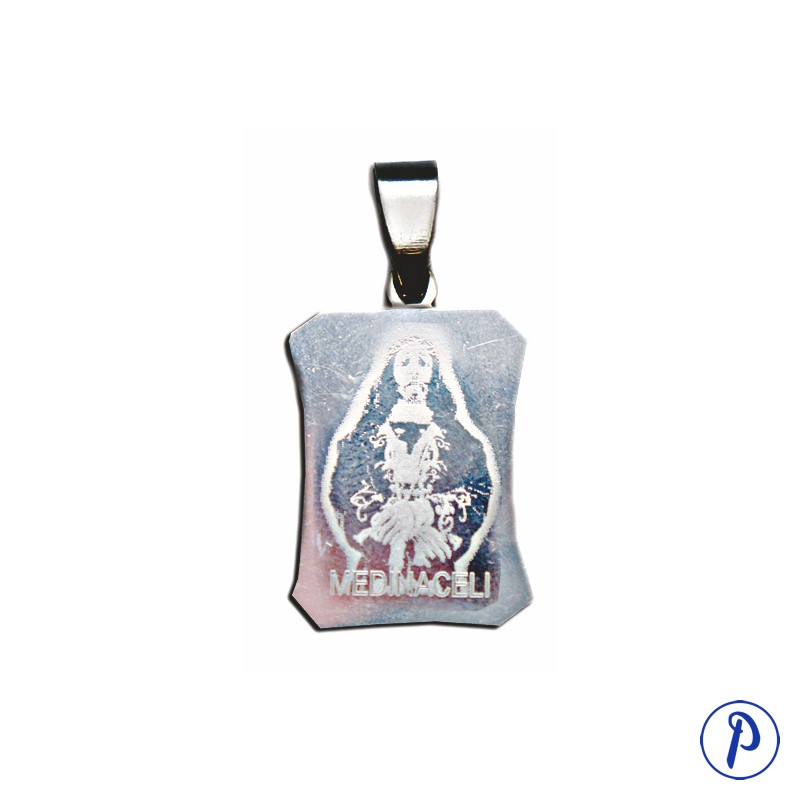 Medalla de acero en forma rectangular curvado con imagen personalizada grabada en el acero. Tamaño aproximado 2,5 x 1,5 cm.