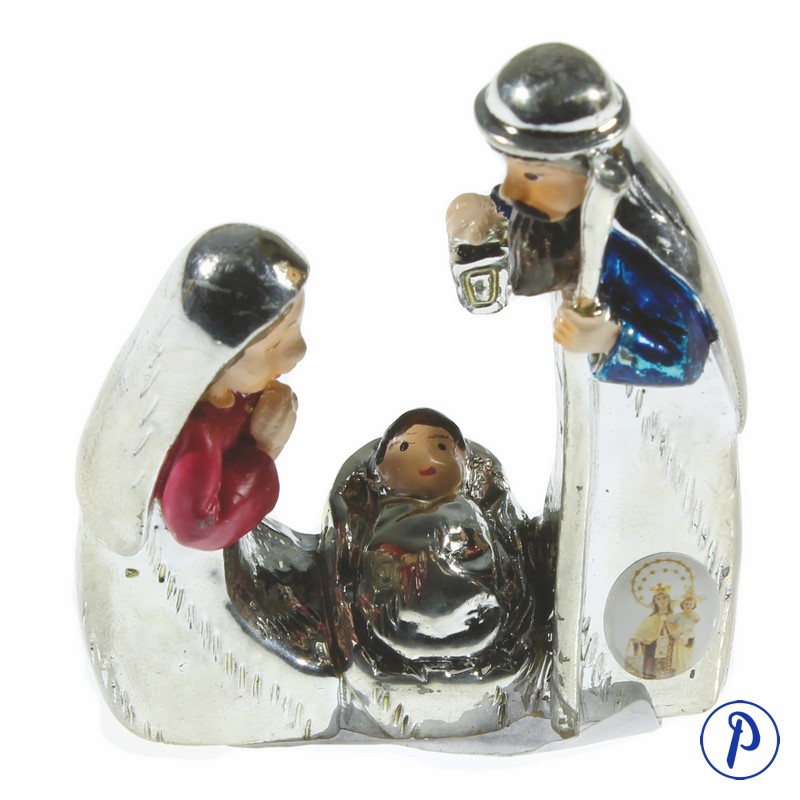 Artículo de Navidad. Figuras nacimiento Niño Jesús, María y José con detalles en baño de plata. Tamaño aproximado 6,5 x 5,5 cm.
