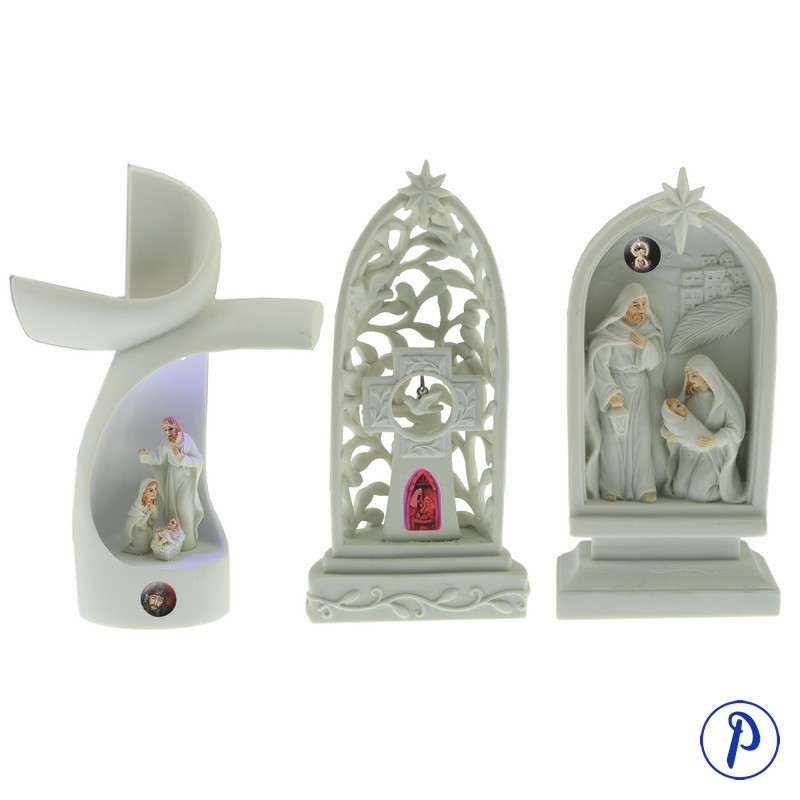Artículos de Navidad. Surtido de nacimientos en resina blanca en 3 modelos: Cruz moderna con nacimiento, Capilla calada y Nacimiento. Incluyen imagen personalizada.