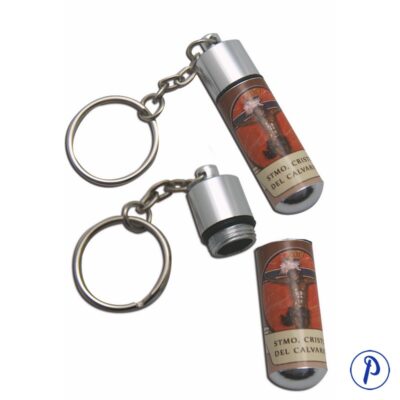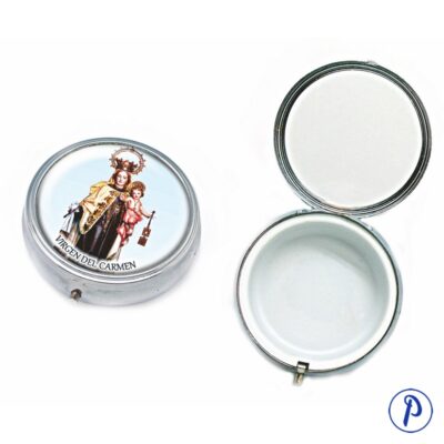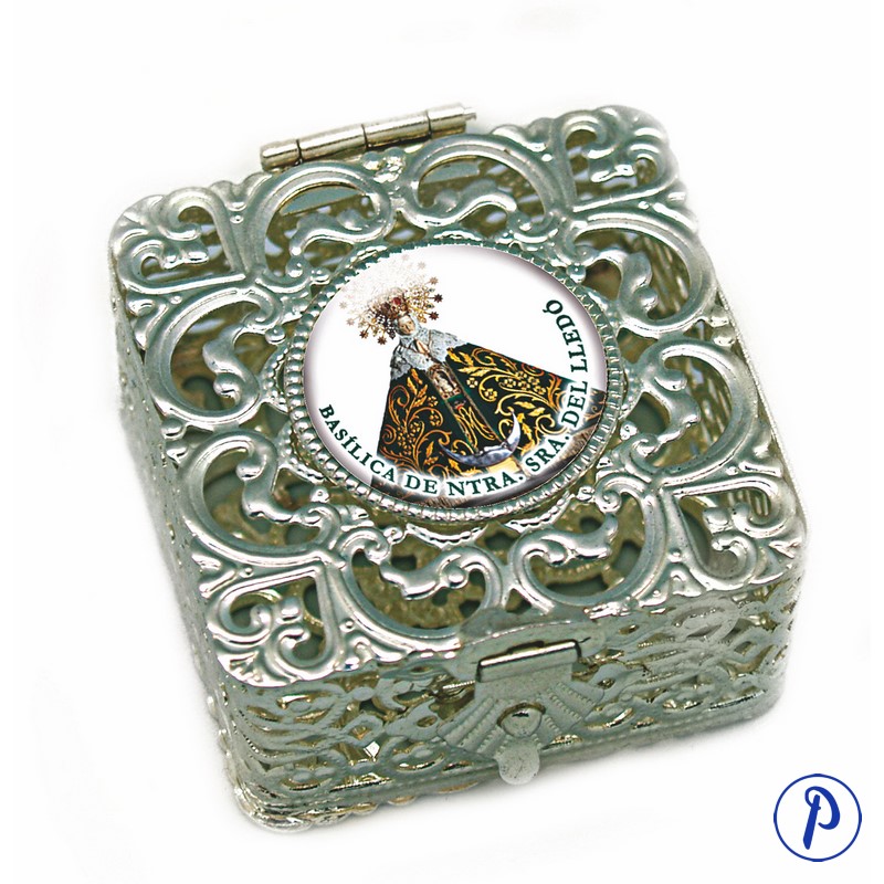 Pastillero y rosariera, dos en uno, en forma cuadrada con adornos. Contiene imagen personalizada. Tamaño aproximado 4,5 x 4,5 cm.