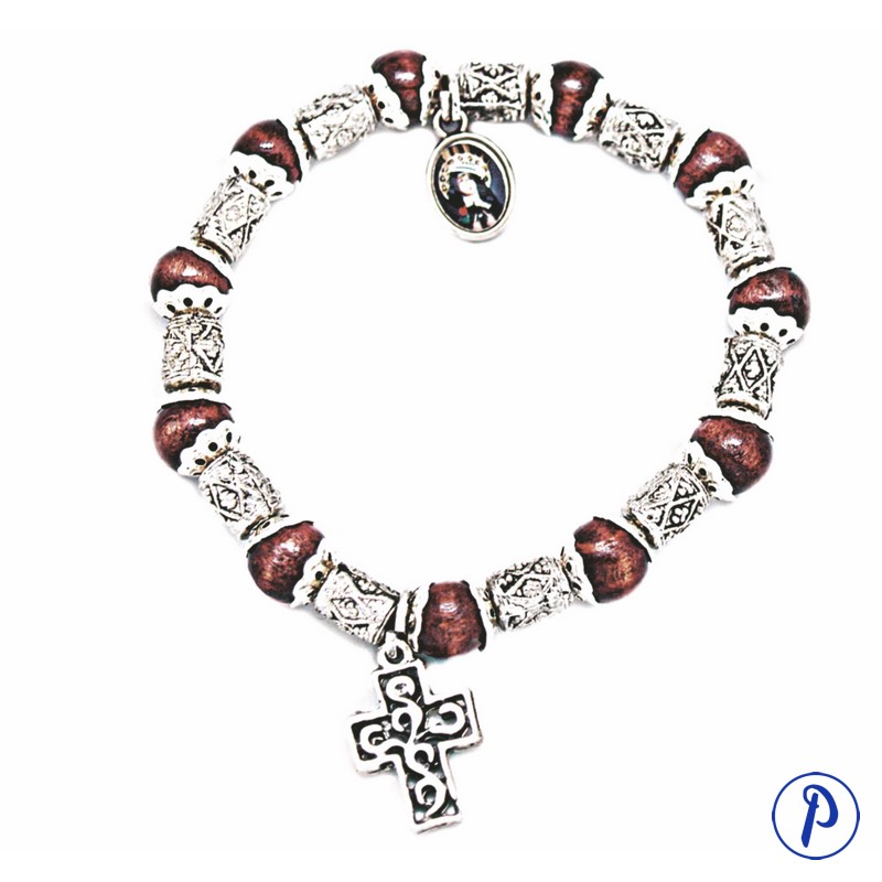 Pulsera adornada con bolitas de madera y anillos anchos metálicos con filigrana, con cruz e imagen personalizada en medallita ovalada.