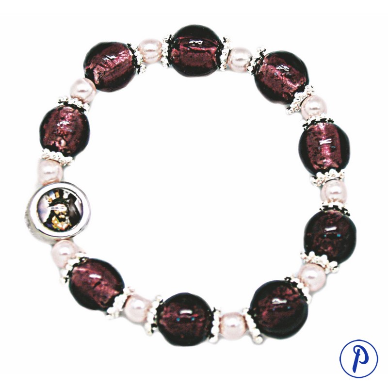 Pulsera adornada con bolas grande de color morado separadas por perlas pequeñas blancas con imagen personalizada en medallita redonda.