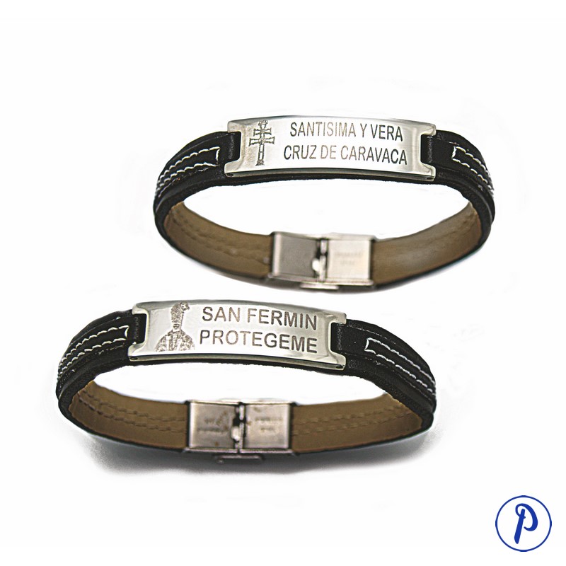 Pulsera de acero con imagen y texto personalizado grabado. Cinta de cuero con cierre metálico.