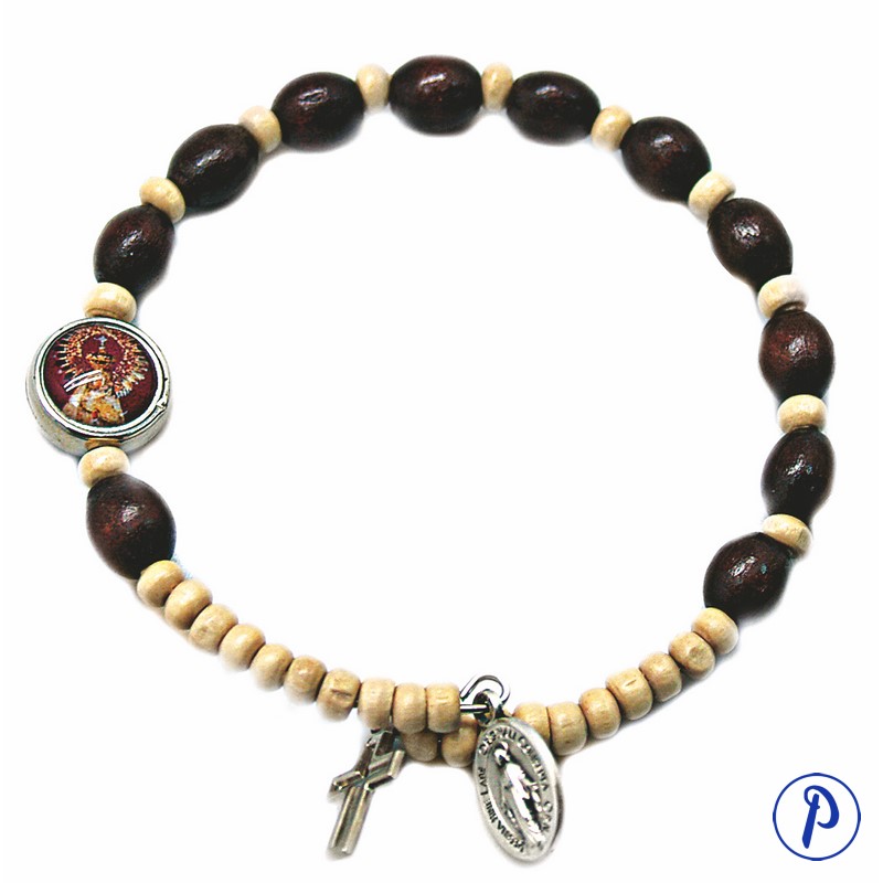 Pulsera en madera con bolas grandes en madera oscura y bolas pequeñas en madera clara. Imagen personalizadada en medallita redonda y cruz colgante.