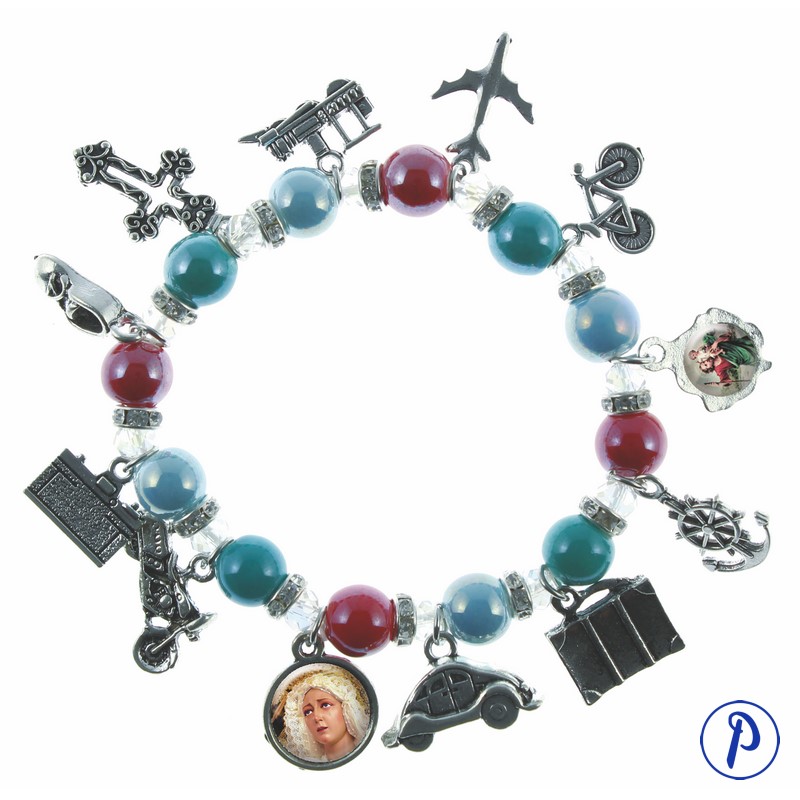 Pulsera «Protégeme en el viaje». Pulsera con apliques metálicos que representan los diferentes medios de transportes. Lleva la imagen venerada del cliente y a San Cristóbal para proteger al portador de la pulsera.