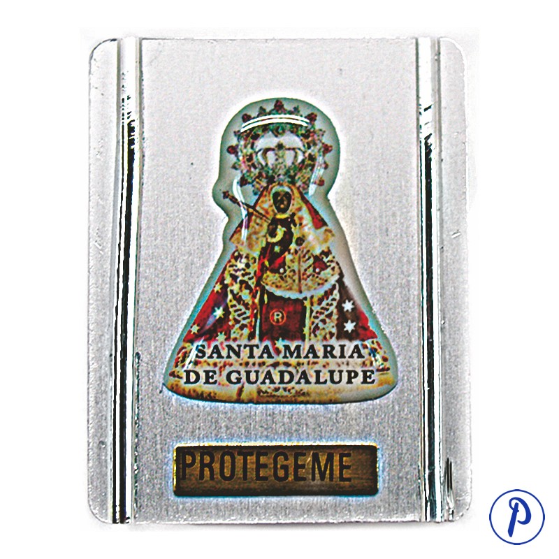 Repié de sobremesa en forma rectangular en aluminio con silueta personalizada en fotoesmaltado y texto «Protégeme». Tamaño aproximado 5 x 4 cm.