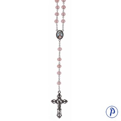 Rosario con cuentas pequeñas redondas en colores surtidos con imagen personalizada en medallita redonda. Presentado en caja plástico transparente en forma de cruz.