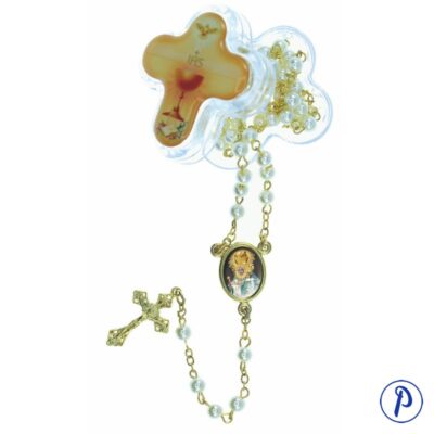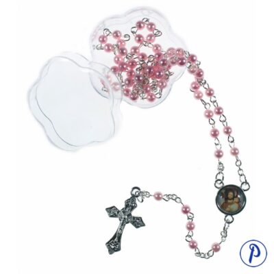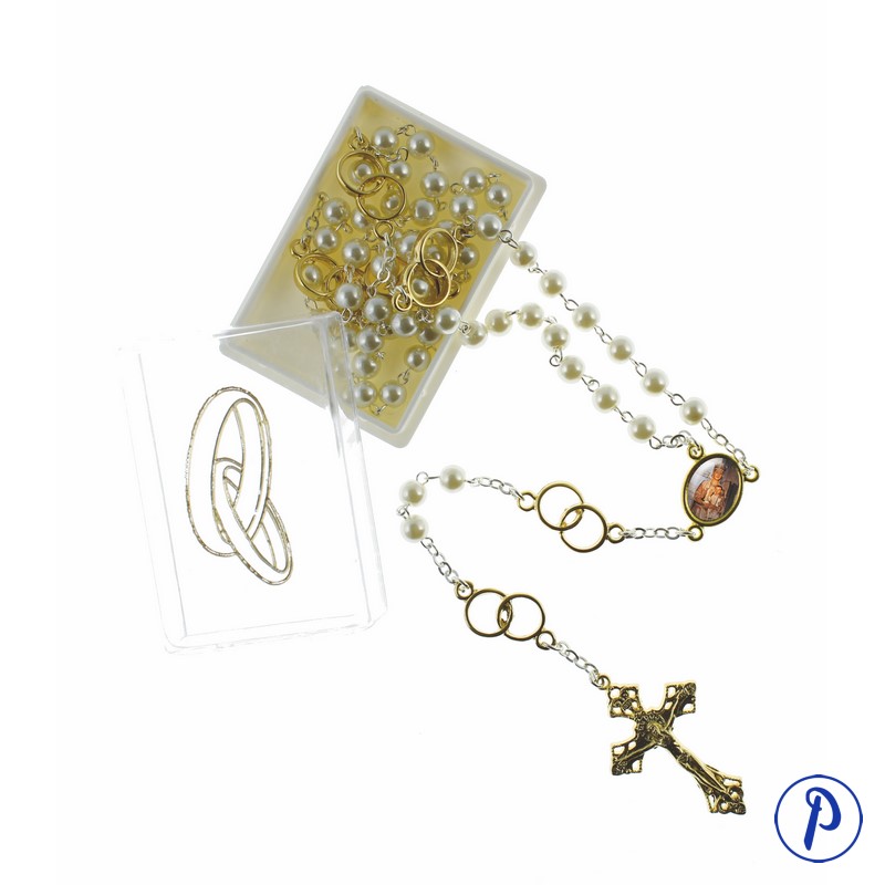 Rosario de Bodas de Oro. Rosario bañado en oro con cuentas de perla e imagen personalizada en medallita ovalada. Contiene motivos de bodas de oro. Presentado en caja.