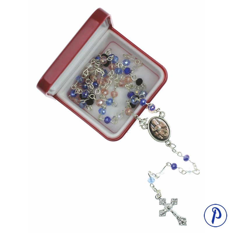 Rosario tamaño mini con cuentas de cristal en diferentes colores e imagen personalizada en medallita ovalada. Presentado en caja.