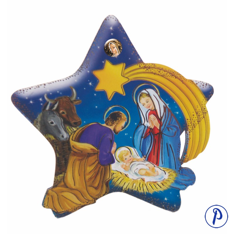 Artículos de Navidad. Soporte nacimiento en forma de estrella con nacimiento e imagen personalizada. Tamaño aproximado 10 x 9,5 cm.